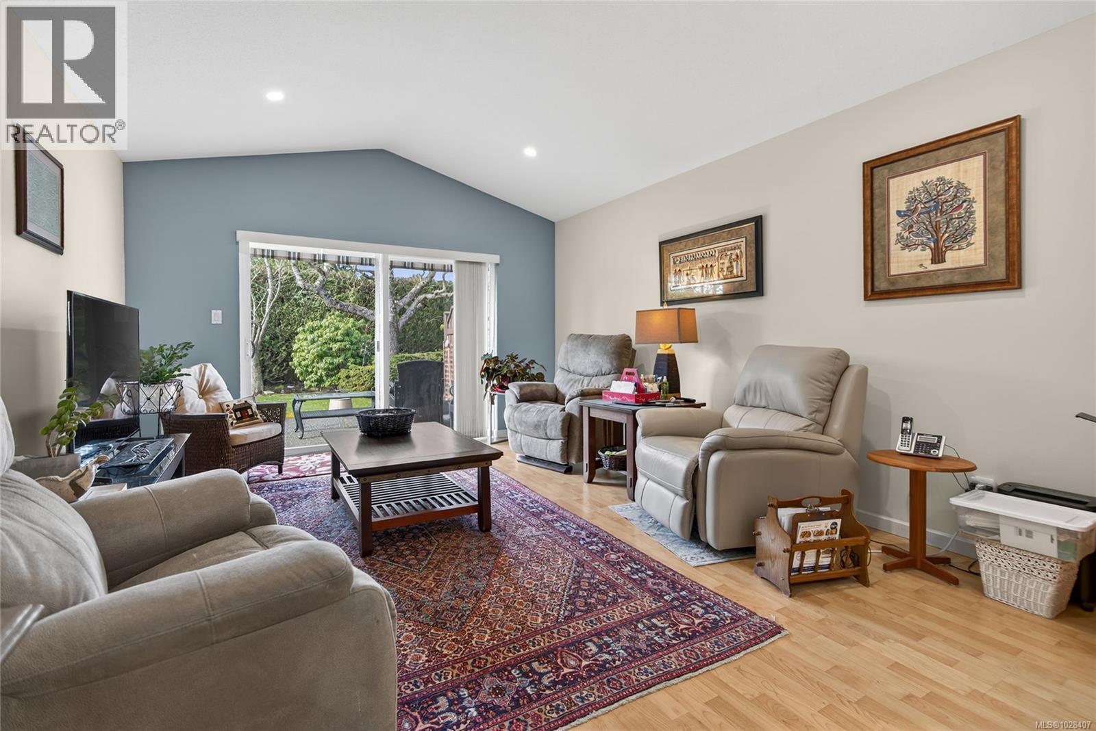 Welcome to this cozy patio home in the gated Highland Glen community. A welcoming tiled entry leads to a versatile bedroom or den. An open floor plan, vaulted ceilings and a skylight fill the home with natural light. The bright kitchen features white cabinetry, stainless steel appliances, a skylight, and an island with a double sink and breakfast bar. Laminate flooring runs throughout the main living areas, highlighted by a warm 3-sided gas fireplace and a separate dining area with sidelights. The spacious primary bedroom includes a 5-piece ensuite with double sinks, a soaker tub, and separate shower. Additional features include a single garage and double-wide driveway, heat pump, and a private patio in the backyard. Pet friendly with no age restrictions, all just minutes from shopping, walking trails, the aquatic centre, and Comox Valley Hospital. (id:37104)