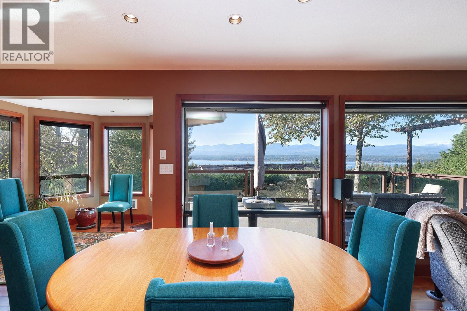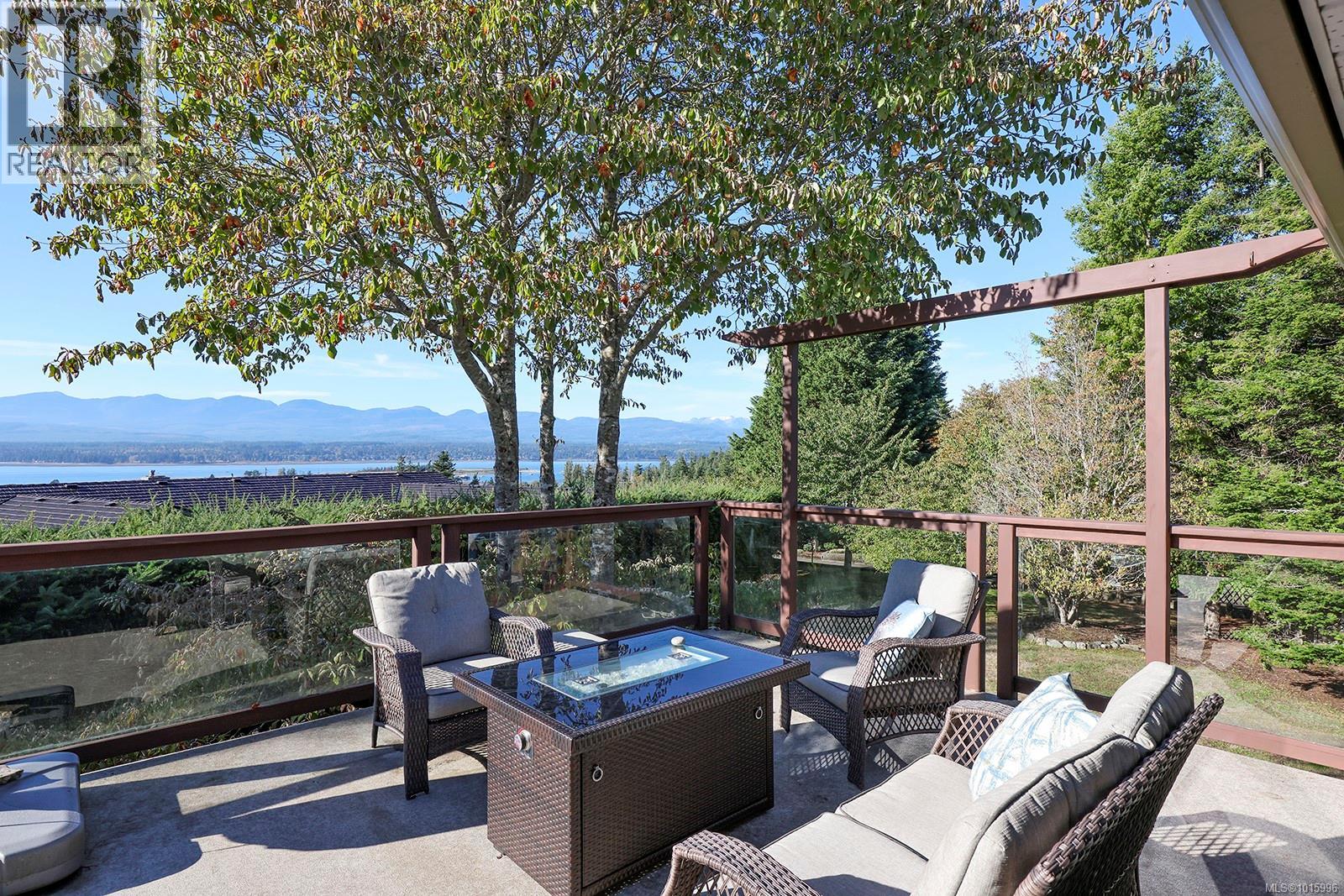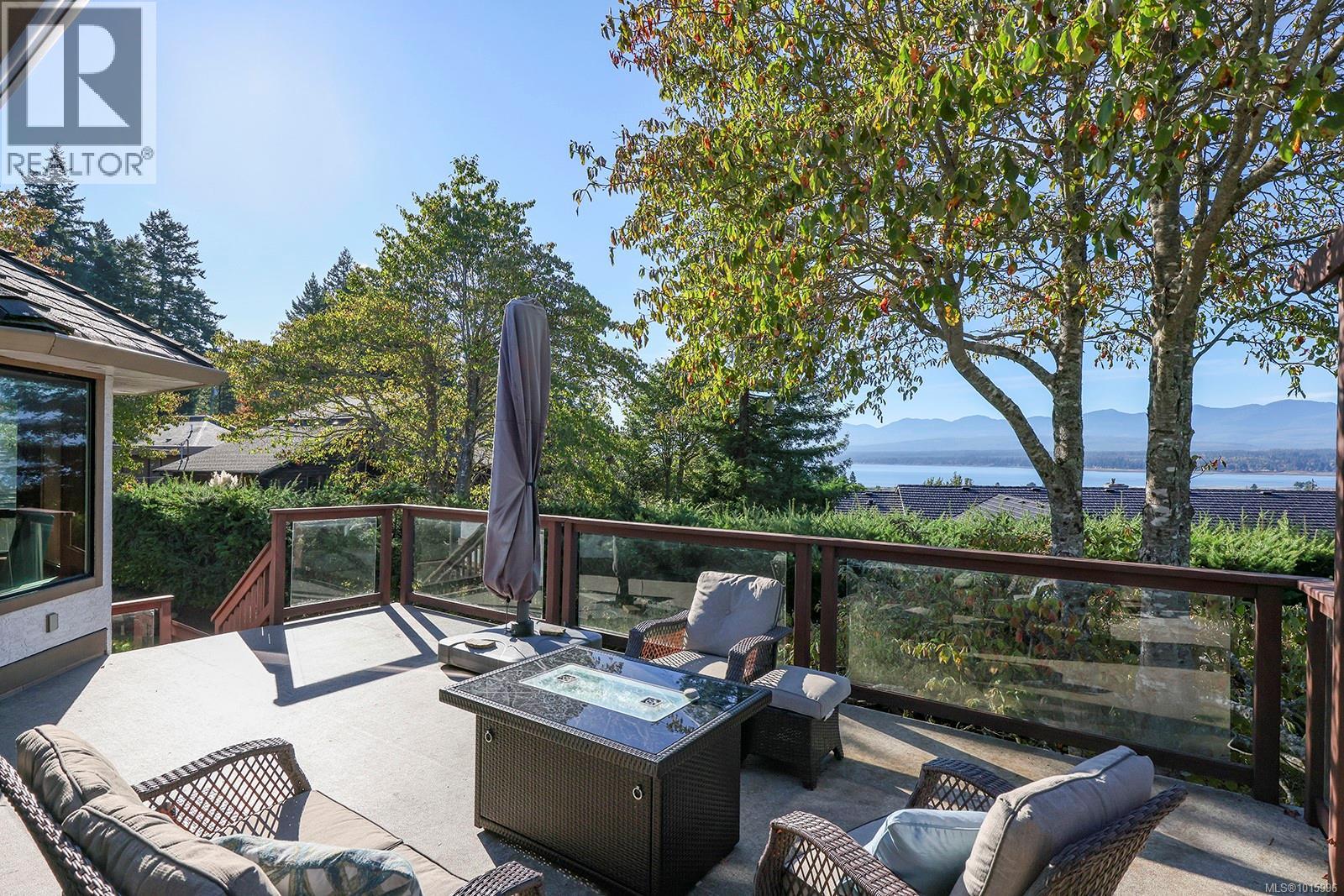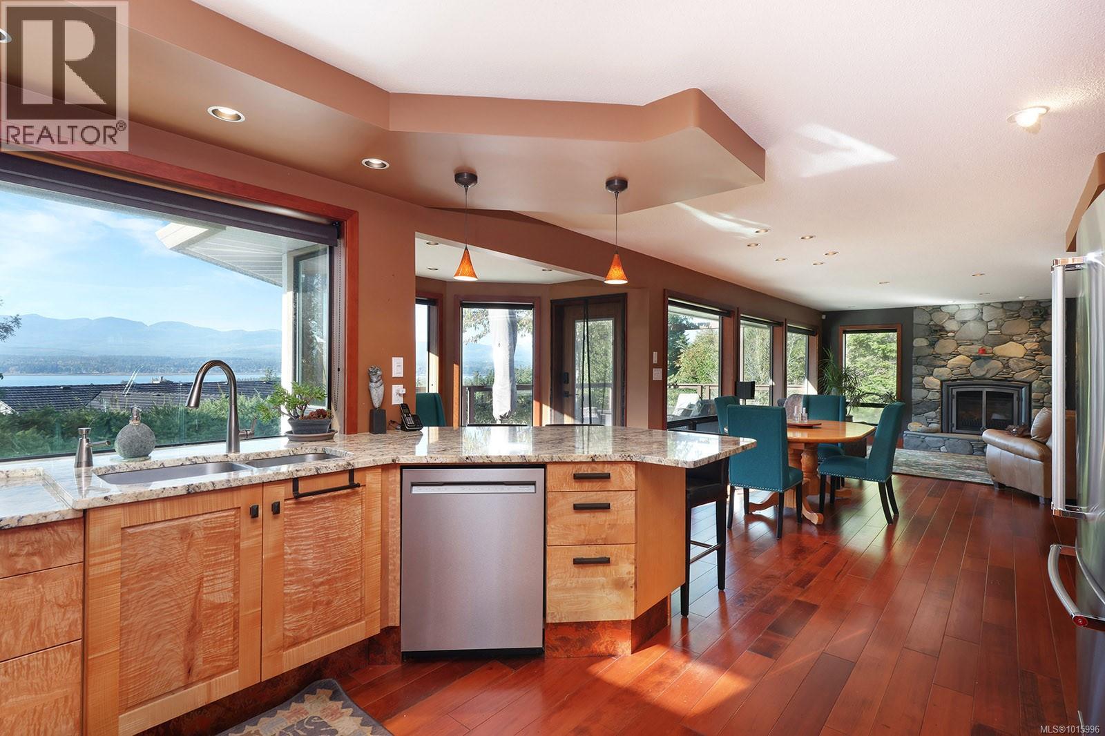Discover the perfect blend of rural charm and urban convenience with this stunning property perched on over half an acre, offering panoramic views of Comox Bay and the Beaufort Mountains. Tucked away in a quiet, sought-after neighbourhood, this beautiful home feels like a private country escape while you can still walk to town. From the moment you step into the spacious foyer, a sweeping curved staircase welcomes you to the main living area, where no detail has been over-looked. The oversized windows flood the space with natural light and incredible views. Gourmet kitchen with custom cabinetry, lots of granite, high-end stainless steel appliances, and cherry hardwood floors throughout. Relax by the floor-to-ceiling stone fireplace or step out onto the expansive deck with glass railings—perfect for entertaining or soaking in the views. (id:37104)
