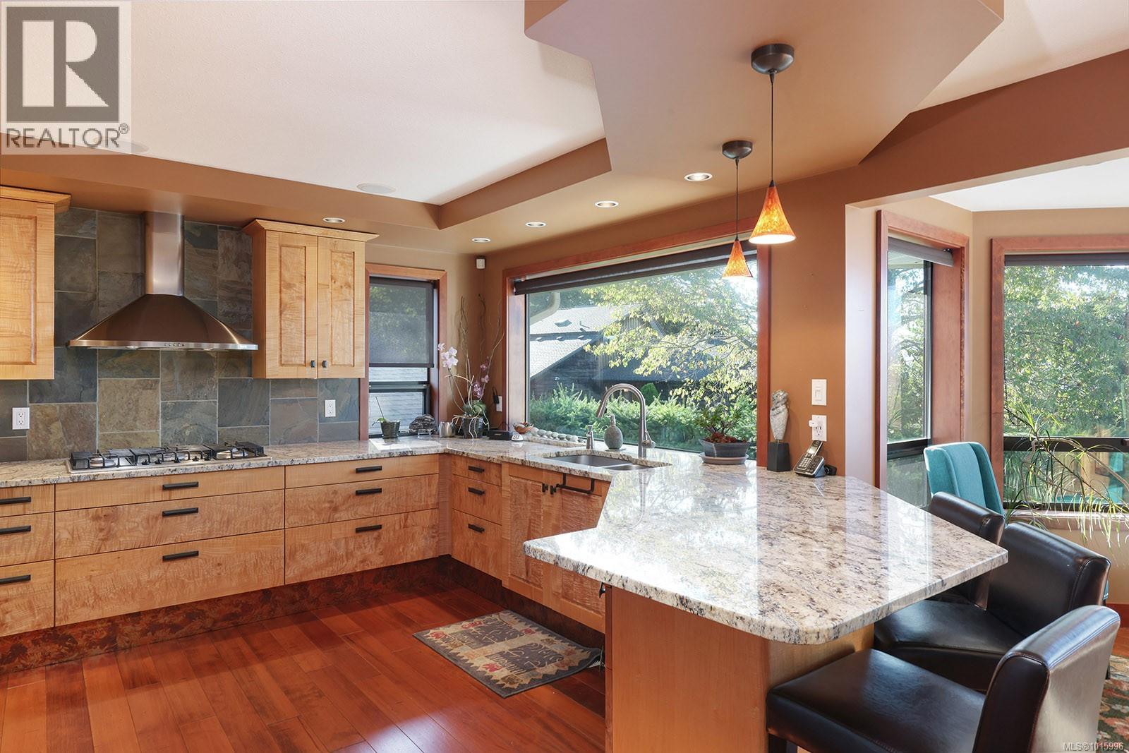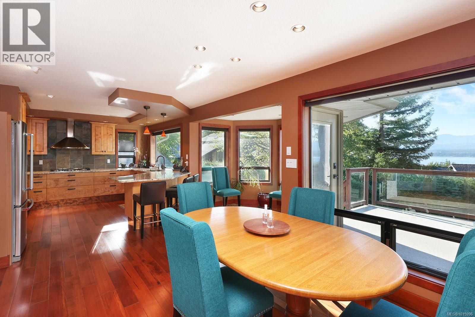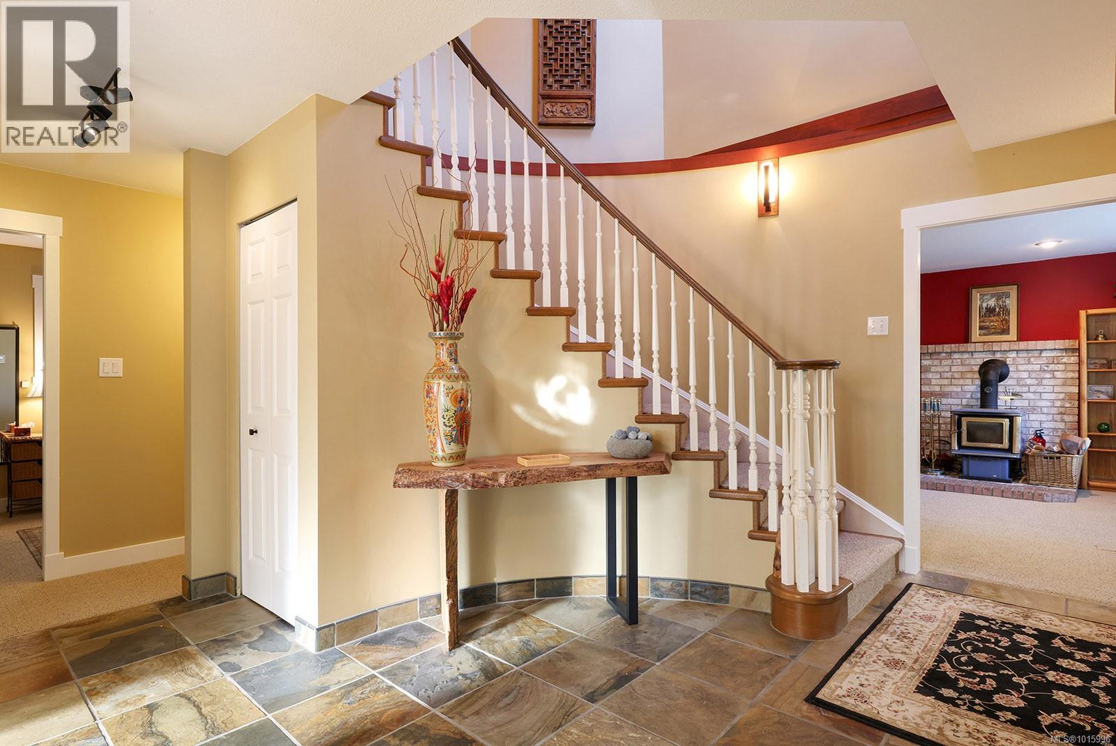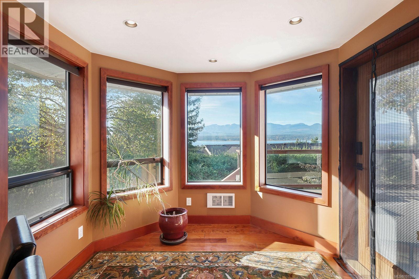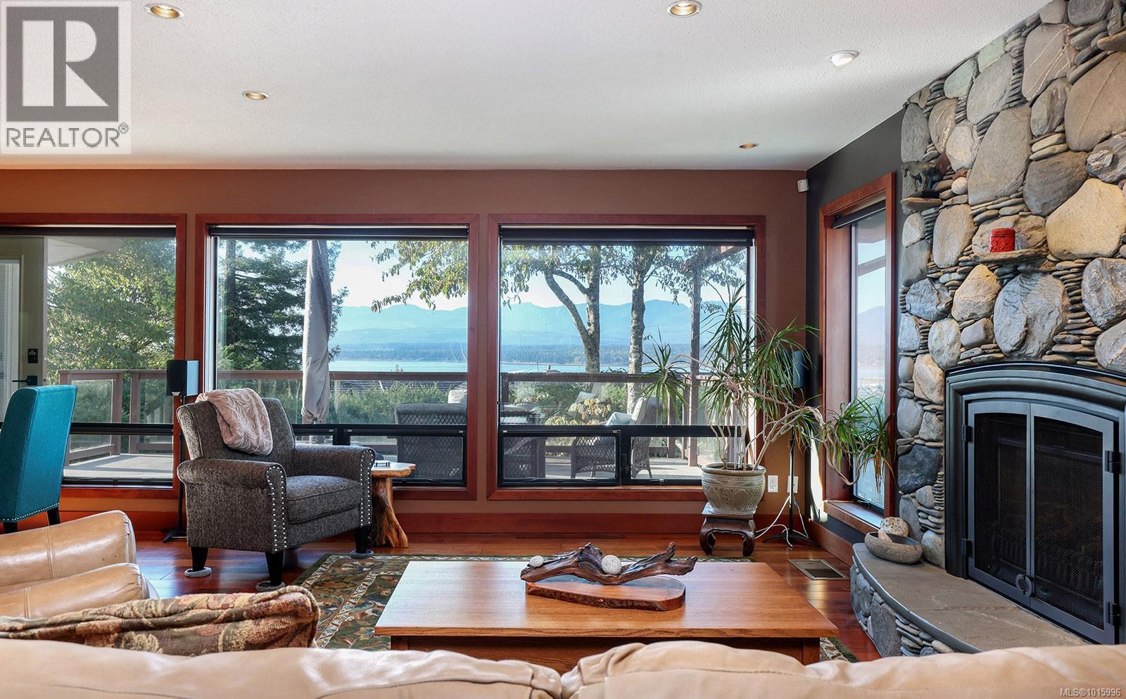 Discover the perfect blend of rural charm and urban convenience with this stunning property perched on over half an acre, offering panoramic views of Comox Bay and the Beaufort Mountains. Tucked away in a quiet, sought-after neighbourhood, this beautiful home feels like a private country escape while you can still walk to town. From the moment you step into the spacious foyer, a sweeping curved staircase welcomes you to the main living area, where no detail has been over-looked. The oversized windows flood the space with natural light and incredible views. Gourmet kitchen with custom cabinetry, lots of granite, high-end stainless steel appliances, and cherry hardwood floors throughout. Relax by the floor-to-ceiling stone fireplace or step out onto the expansive deck with glass railings—perfect for entertaining or soaking in the views. (id:37104)