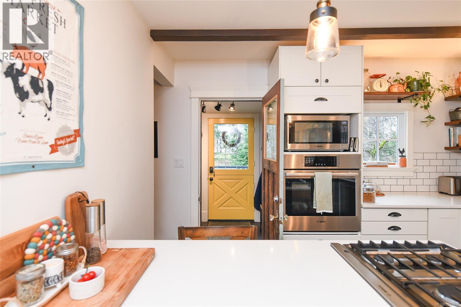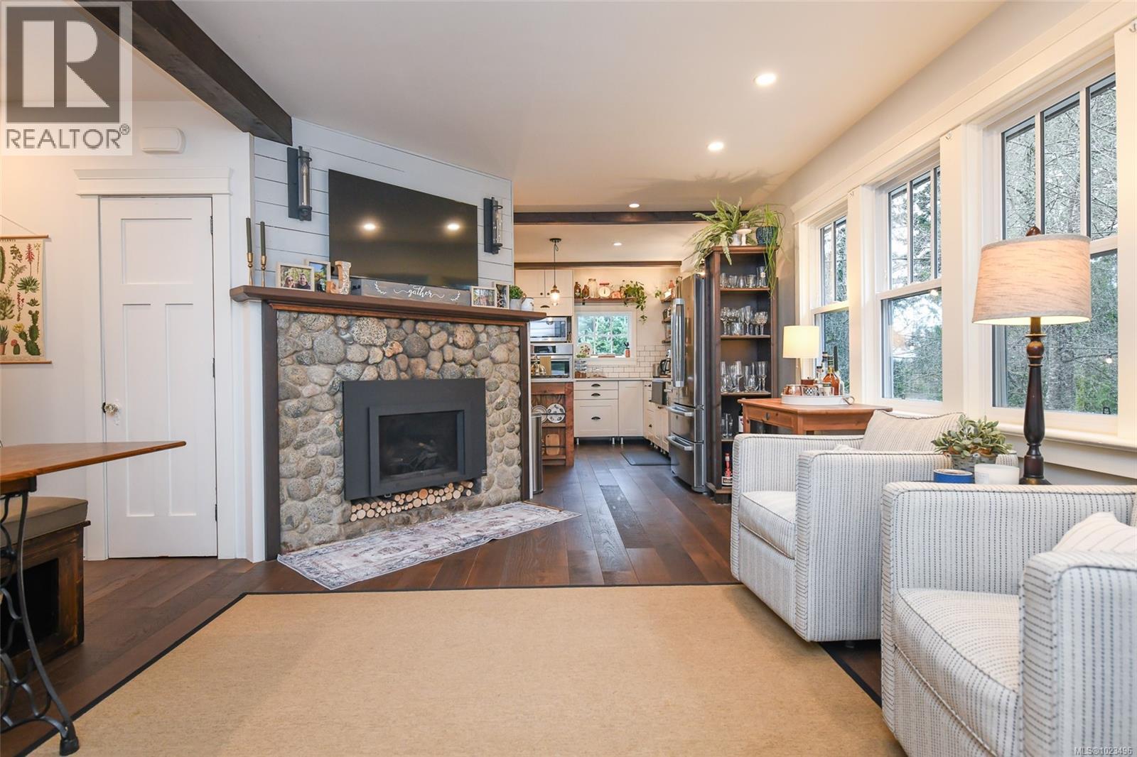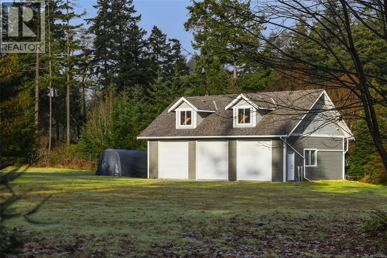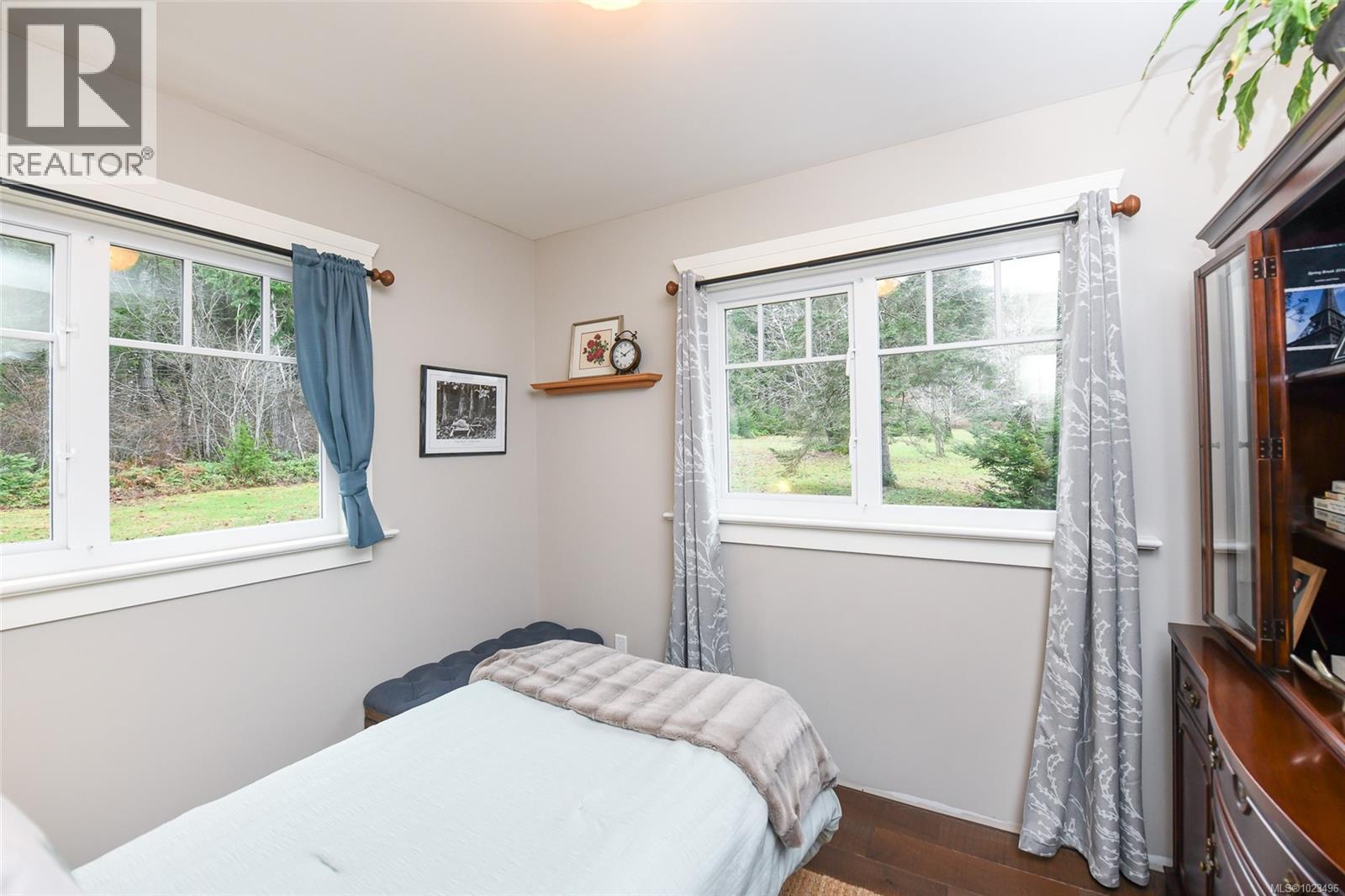 Rare opportunity to own a fantastic 4-acre property that includes a charming farmhouse plus large detached garage/studio space, in the highly desirable Comox Peninsula. The main home was professionally & thoughtfully renovated in 2017 with permits. The main level features character-filled living spaces anchored by rich wood flooring & cozy propane fireplace plus 2 bedrooms. The thoughtfully designed kitchen offers a custom island with gas (propane) cooktop, apron sink, quartz countertops, Bosch stainless appliances & a walk-in pantry. Upstairs, the loft bedroom creates a private retreat complete with a soaker tub & retractable wardrobe. Extensive upgrades include spray-foam insulation, geothermal heat pump, new windows, and two separate 200-amp electrical services (home & shop), ensuring efficiency & flexibility for future use. The detached 3-bay shop boasts 14’ ceilings, a 2 piece bath & over-height overhead doors, ideal for trades, storage, hobbies, or recreational vehicles. One bay is fully insulated & drywalled with its own mini-split heat pump; offering guest, studio or workspace potential. Zoning allows for two full-size homes, presenting an outstanding opportunity for multi-generational living, future development or investment. A truly special property combining acreage, walkability, premium upgrades & long-term potential; rarely available in this coveted Comox Peninsula location. This home is just a short walk to town, parks & beaches! (id:37104)