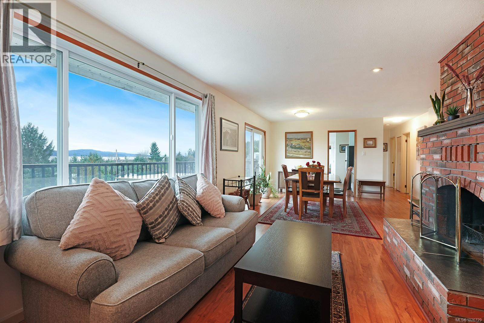 Enjoy the stunning ocean & mountain views of Baynes Sound while perched up on a large .82A LOT. Conveniently located in Union Bay, this home offers both privacy & accessibility to the amenities offered by this seaside village. The circular driveway leads you up to the portico linking the house to a huge 750 sq ft (24'2''X29'2'') detached garage/man cave with a new WETT certified pellet stove. Main level entry offers fabulous views along with 3bed/2bath. The living room has a wood burning fireplace with a custom brick surround. The bright walk-out basement level offers view, lg family room, summer kitchen, 1 bed/ 1 bath, lots if storage PLUS new WETT certified wood stove that heats the whole house. Brand new windows, doors, appliances & bedroom flooring. Recent updates also include septic, perimeter drains & gutter. Glassed in sunroom/mudroom keeps it all nice & bright. Lots of outside storage too. This house has it all and is waiting for it's new family. Come check it out, you won't be disappointed. (id:37104)